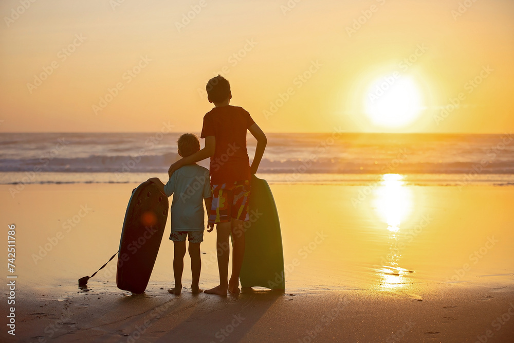 Happy children, boys, playing on the beach on sunset, kid cover in sand, smiling, laughing