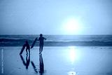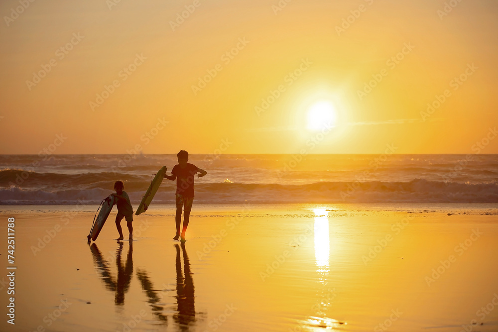 Happy children, boys, playing on the beach on sunset, kid cover in sand, smiling, laughing