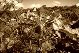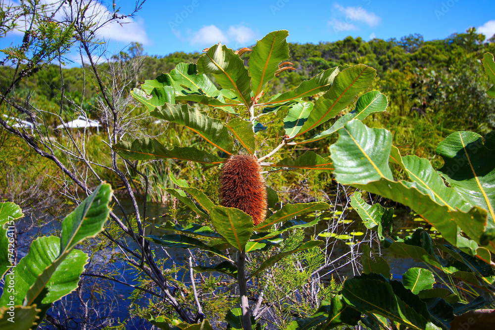 Banksia robur (swamp banksia) growing in a peaty sand coastal area of the Kingfisher Bay Resort on the west (continental) coast of Fraser Island in Queensland, Australia