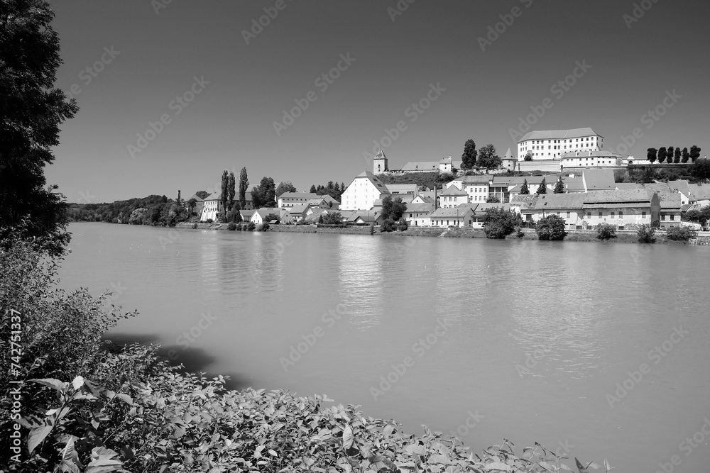 Ptuj Castle. Architecture of Slovenia. Black and white photo.