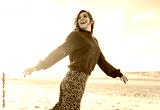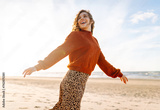 Portrait of the beautiful woman at the windy spring day relaxing on coast. Travel, weekend, relax and lifestyle concept.