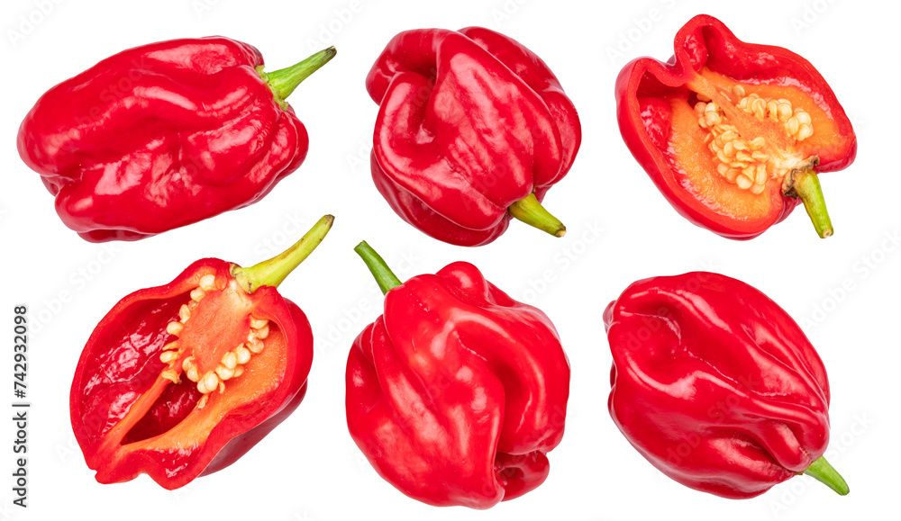 Set of red habanero peppers on white background. File contains clipping paths.