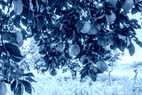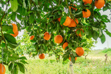 Ripe orange fruits on orange tree between lush foliage. View from below.