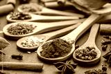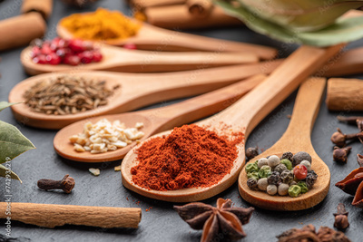 Various types of spices on wooden spoons on a gray stone table.