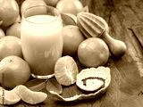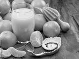 Orange tangerine fruits and glass of fresh tangerine juice on dark wooden background. Top view.
