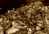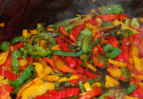 Yellow red and green peppers sizzling on the hot griddle of a street food truck cooking with spices and oil