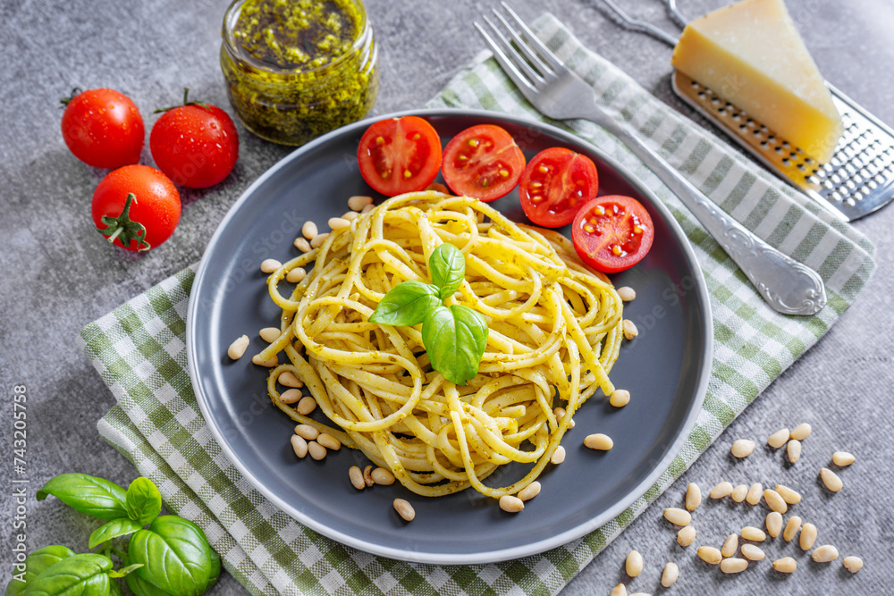 Pasta pesto, spaghetti with pesto sauce and fresh basil leaves in black plate on gray stone background served with food ingredients. Traditional italian cuisine.