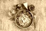 Pasta pesto, spaghetti with pesto sauce and fresh basil leaves in black plate on gray stone background served with food ingredients. Traditional italian cuisine. Flat lay, top view