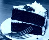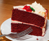 Red velvet cake with decorated white frosting and fork on the plate