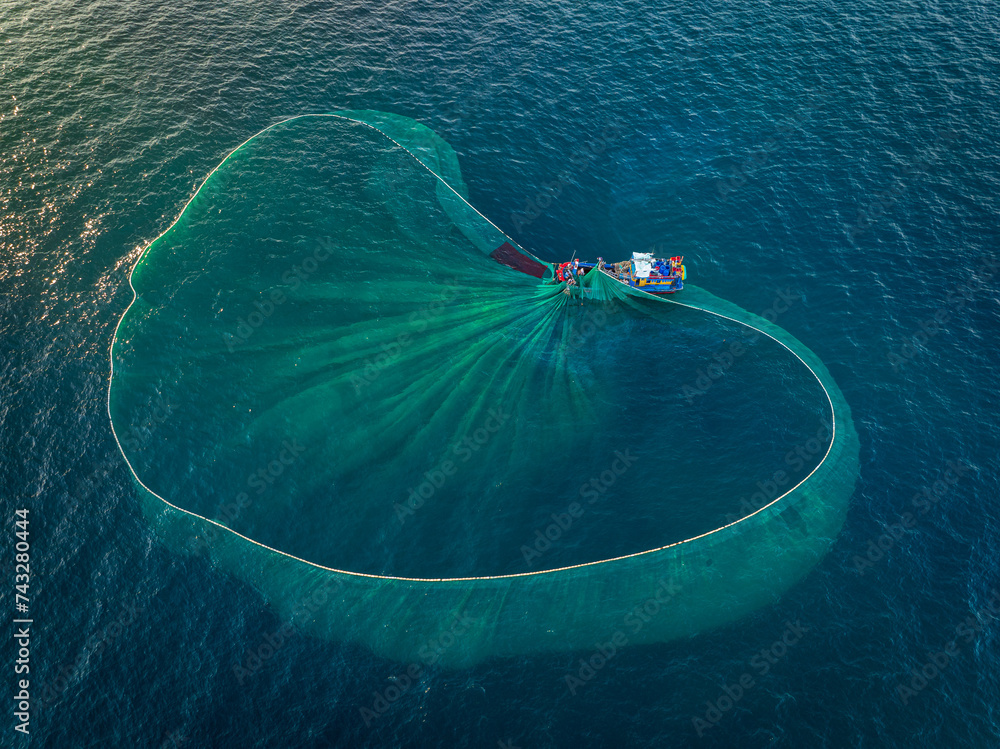 Drone view a fishing boat is netting anchovies on Nha Trang sea - Nha Trang city, Khanh Hoa province, central Vietnam