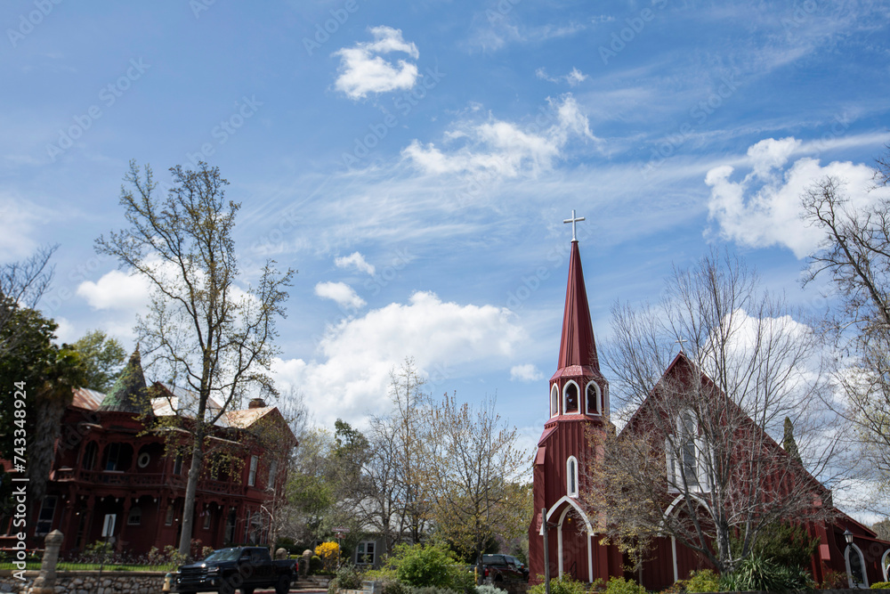 Spring time view of a historic church in downtown Sonora, California, USA.