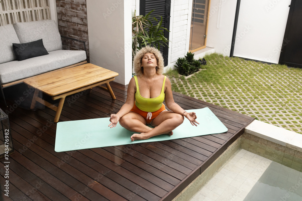 A young adult woman finds serenity during her morning yoga routine on a patio, embracing wellness and tranquility with mindfulness meditation.