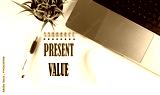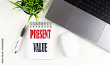 PRESENT VALUE text written on notebook with laptop and mouse , white background