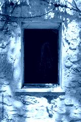 Beautiful and bright stone facade in a provencal mas, or farm. Detail of a barn. Shaows on the wall. Vegetation : blooming rose bush. Dark windows with a rope. Tour du Valat, Arles, Camargue, France.