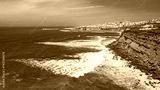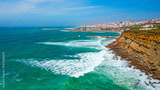 Drone view over long rocky coastline in Ericeira, Portugal, on summer sunny day. Top view - Beautiful natural landscape with ocean rocky shore. Aerial view over Scenic European tourist destination.
