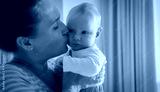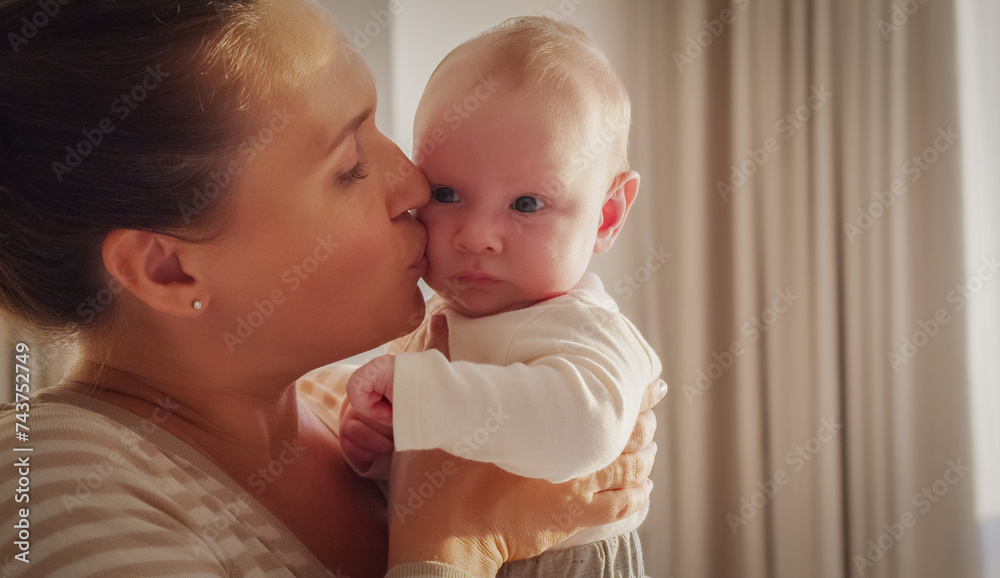Young happy mother holds her newborn baby, window with sunset behind on a background. Closeup portrait of a loving mother with a child. Happy mom with her infant son. Mum loves of her infant child