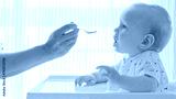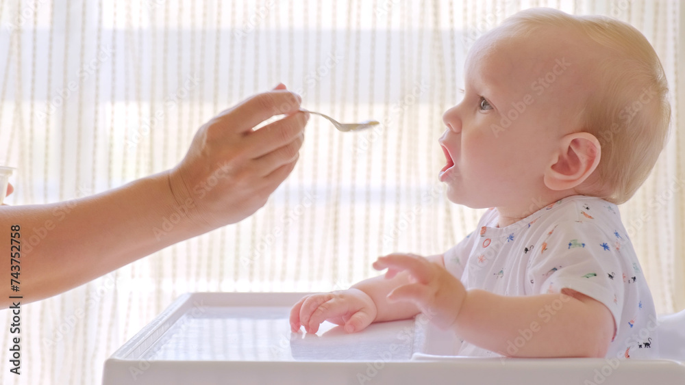 Mother is Feeding a baby from a spoon. Mom feeds a 9 month baby with fruit puree from a spoon, close-up, high key. Infant boy eats sitting on baby's chair. Mother cares about little son.