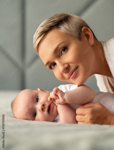 Happy Mother with her newborn baby. Closeup portrait of a short-haired loving mother with her child. Young mom with a beautiful infant child at home. Mum loves her infant son..