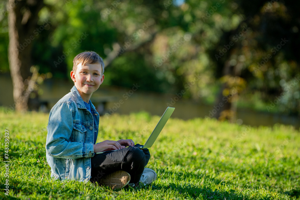 Smiling schoolboy with a laptop sits on a green lawn. Young cheerful school child sitting and typing on computer in the park. Teen Boy studying online with a computer, outdoors. Looking at the camera.