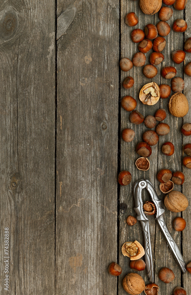Hazelnuts, walnuts and nutcracker on gray wooden background.