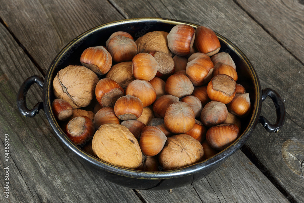 Hazelnuts and walnuts in a metal bowl on a wooden table