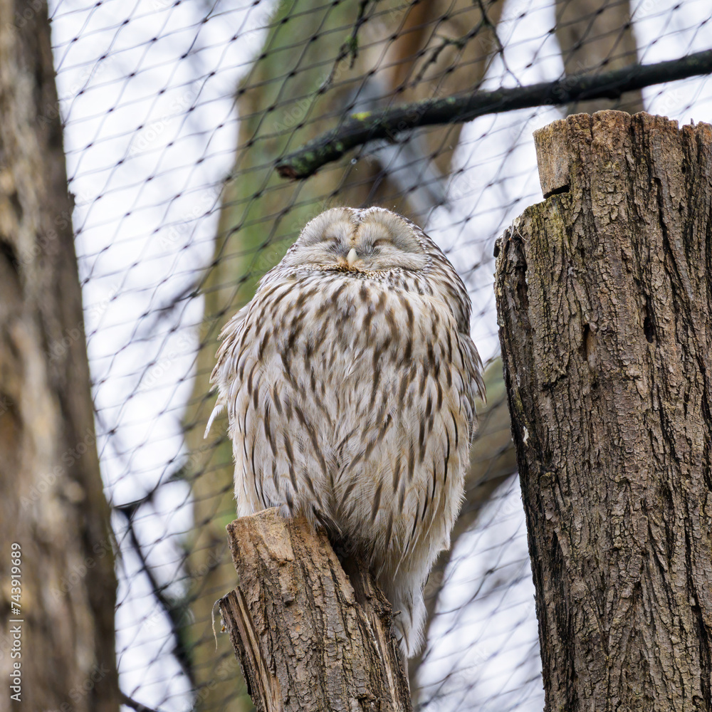 A Ural Owl sitting on tree in a zoo