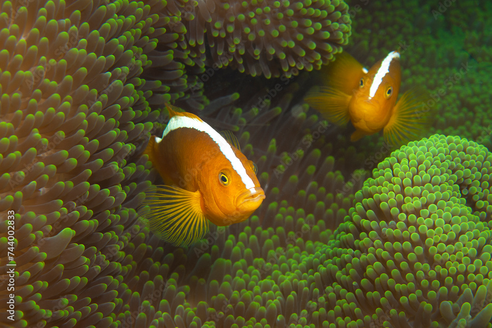 Anemonenfische sind immer neugierig. Orange Anemonenfische in kräftig grüner Anemone im Korallenriff, Unterwasserfotografie, aufgenommen in Raja Ampat, Indonesien. 2 Fische aus der Nähe.