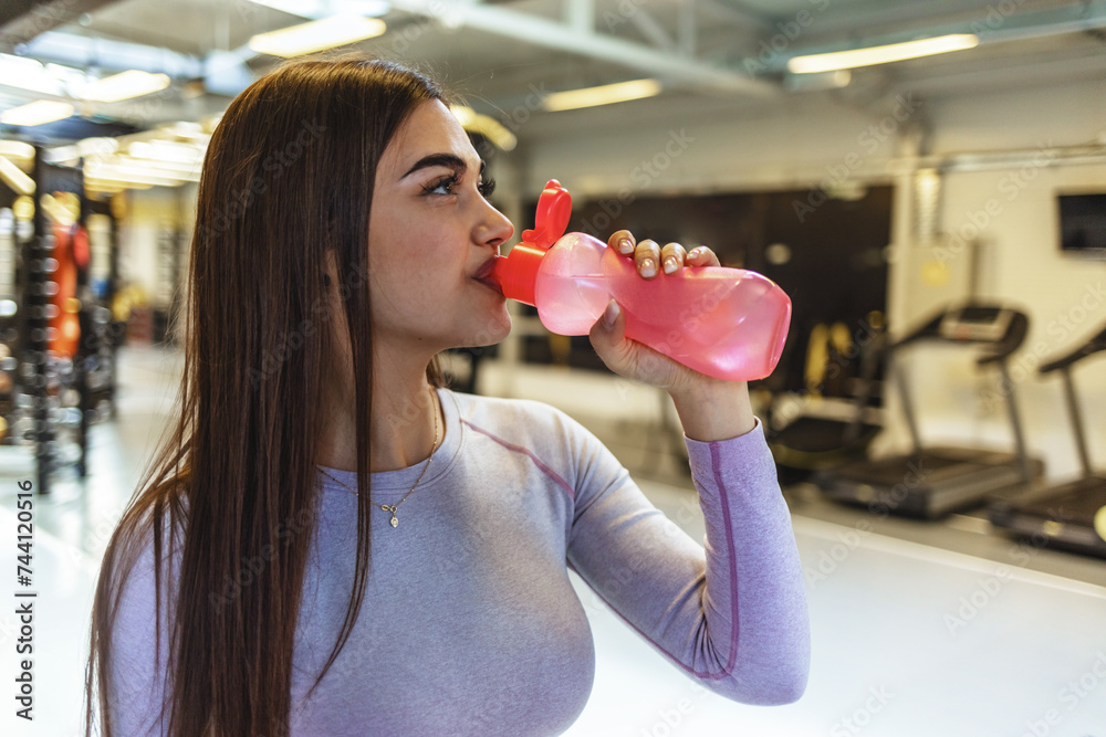 Drinking water and relax after a fitness, workout and exercise training of a woman athlete. Young women with sweat done reaching target cardio sports goal at a health, wellness and sports gym.