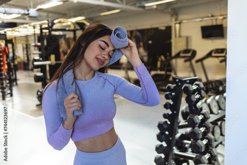 Thinking, tired and woman with towel for sweat in gym after workout, training or exercise. Sports idea, exhausted and sweating female athlete wipe with fabric after exercising, running or cardio.