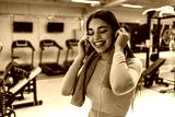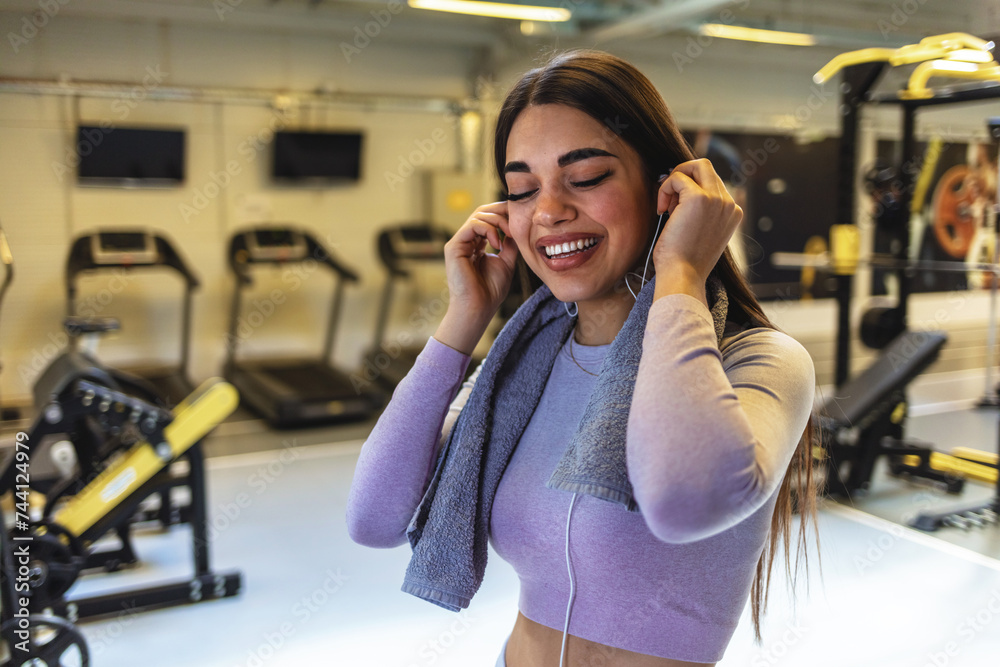 Shot of an attractive young woman standing alone in the gym and listening to music through earphones during her workout.