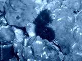 Dark red christmas tree worm on the tropical coral reef. Underwater macro photography from scuba diving. Aquatic worm, marine life in the ocean. Exploring the reef, travel picture.