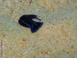 Black and blue tropical nudibranch on the sandy seabed. Underwater photography from scuba diving with marine animal. Aquatic tropical slug on the sand. Underwater macro picture. Sea life.