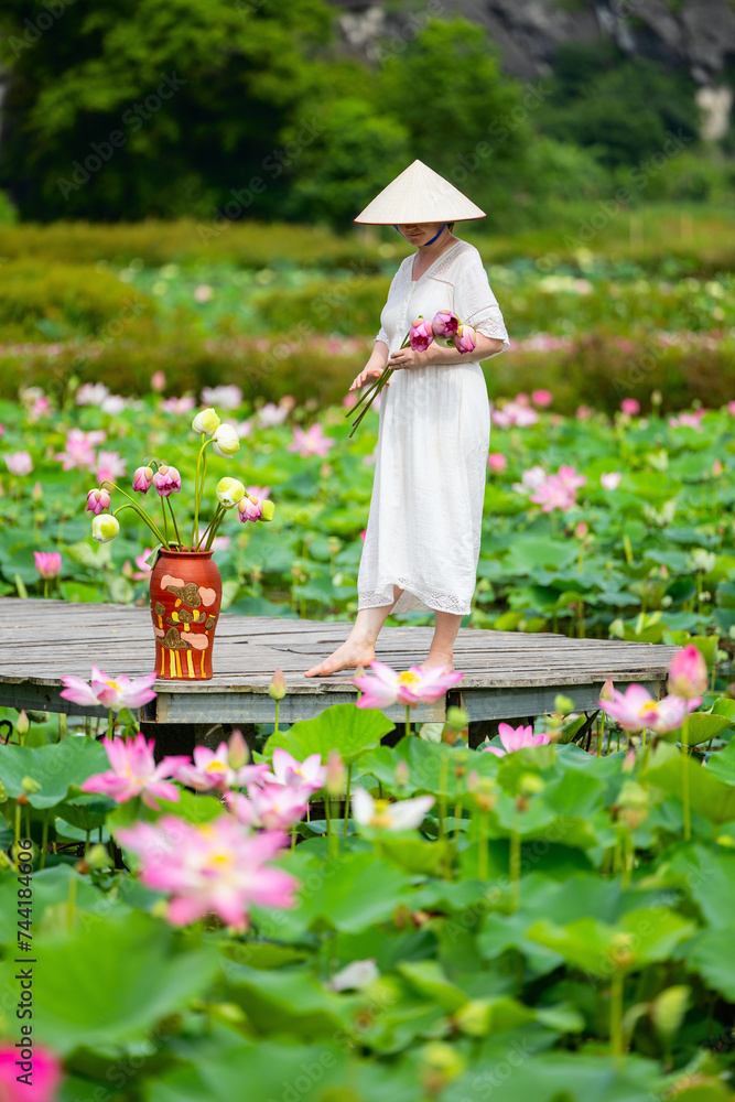 Woman at lotus flower lake