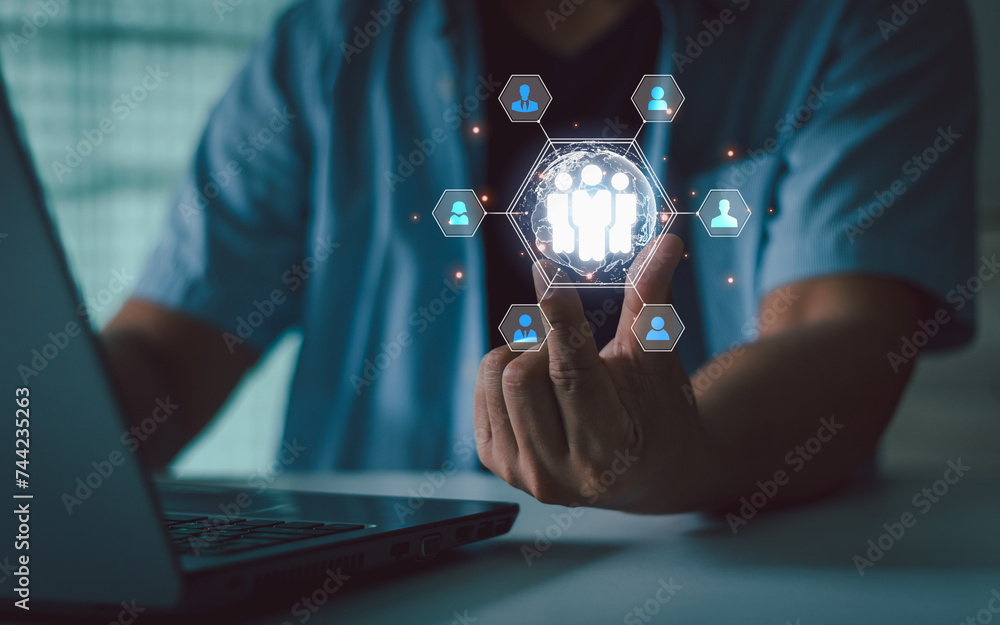 Customer Relationship Management, CRM. Business people use computer with global client network technology, data exchange development. Digital marketing service database. HR social media community.