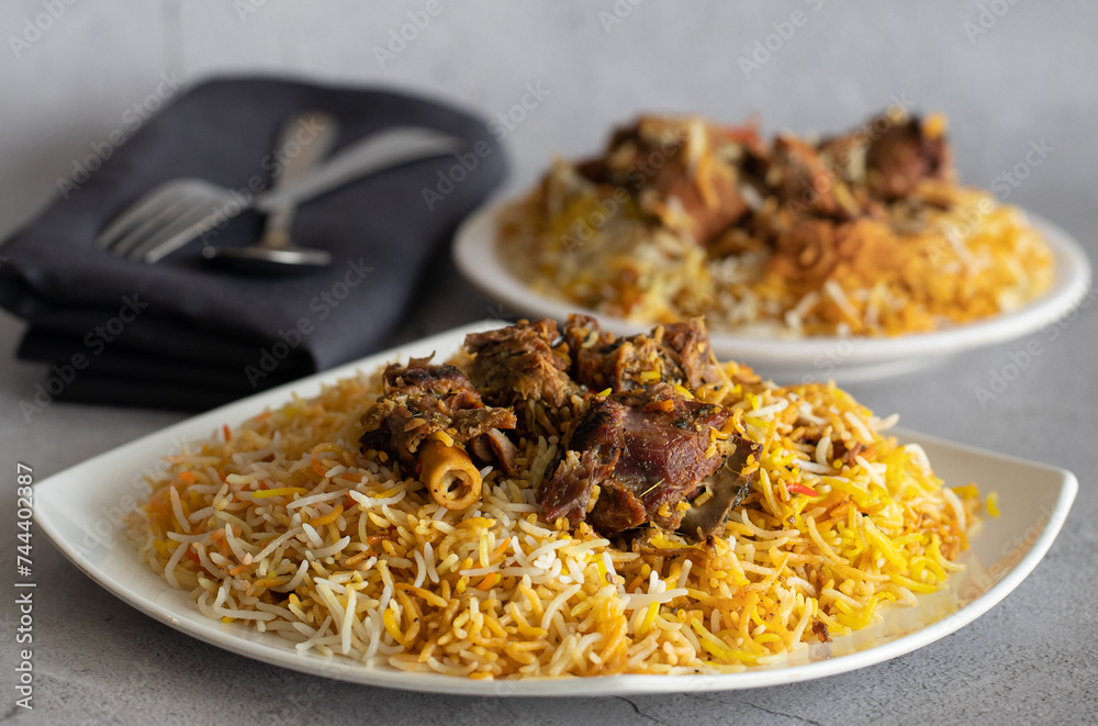 A dish prepared with Rice and pieces of meat of lamb (Mutton Biryani)