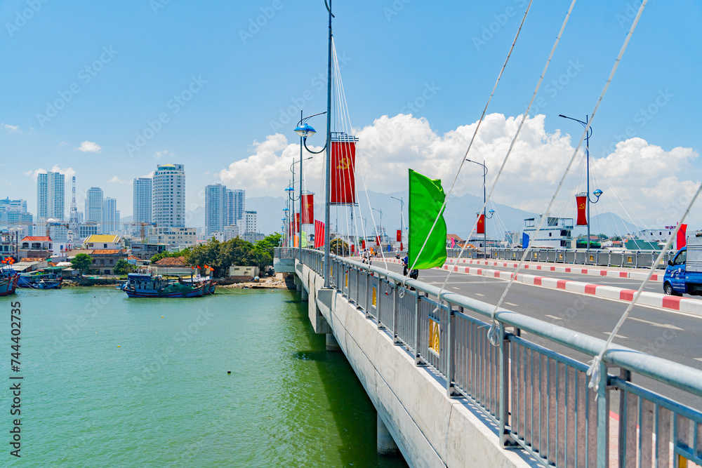 The city bridge over the river. The Kai River in Nha Trang in Vietnam. The urban landscape.
