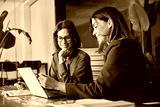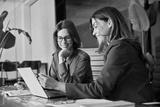 Two happy busy female employees working together using computer planning project. Middle aged professional business woman consulting teaching young employee looking at laptop sitting at desk in office