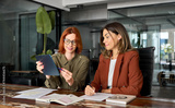 Two busy business women talking using tab working together at desk in office. Professional female colleagues employees looking at digital tablet discussing corporate project sharing ideas at work.
