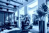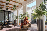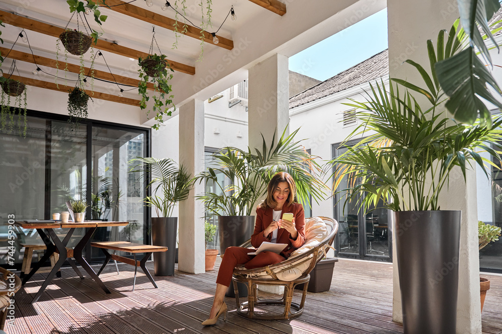 Happy elegant mature middle aged older business woman holding cellphone using mobile cell phone looking at smartphone sitting in comfortable chair in sunny office space with green plants.