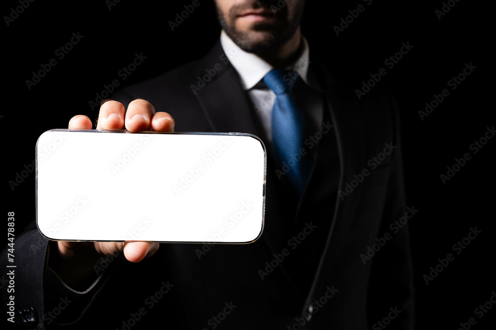 A professional businessman in a suit showcasing a smartphone with a blank screen ready for your content.