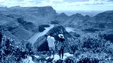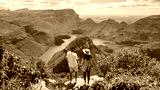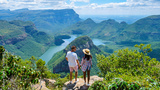 Panorama Route South Africa, Blyde river canyon with the three rondavels, Asian women and Caucasian men on vacation in South Africa looking out over green mountains on a road trip