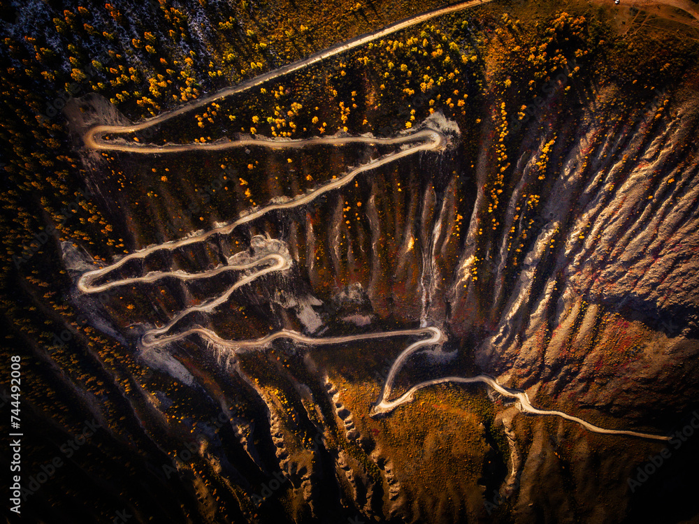 Stunning birds-eye view of the serpentine Katu Yaryk Pass in the Altai during fall season, vibrant foliage and rugged terrain.