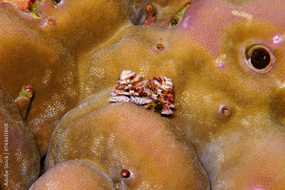 Coral reef animal - christmas tree worm on the tropical reef. Aquatic worm, marine life in the ocean. Underwater macro photography from scuba diving. Reef exploration, travel picture.