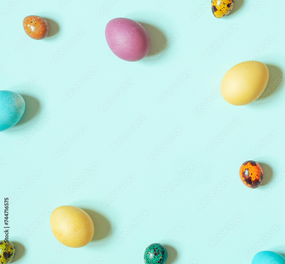 Colorful painted Easter eggs on the blue background. Top view. Copy space