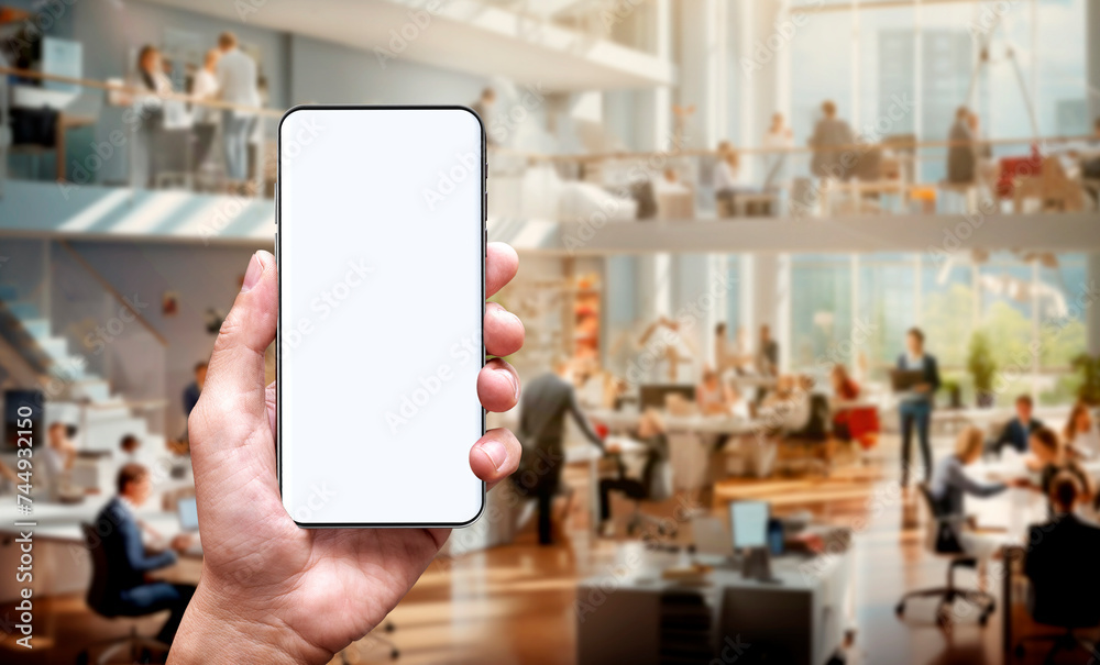 blank of mobile phone at modern office background