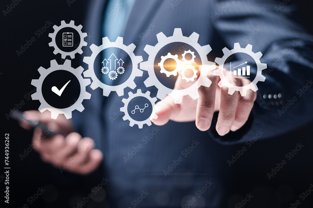 Automation concept. Optimise business process workflow and Robotic process automation. Businessman touching automation icon on virtual screen.