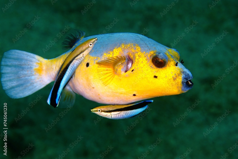 Pufferfish in cleaning station.Yellow blue puffer fish with two blue cleaner wrasses. Tropical coral underwater scenery while scuba diving. Marine life in the ocean.