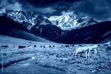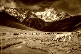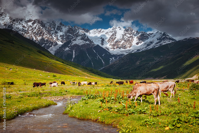 Cows graze on an alpine meadow at the foot of the Main Caucasus Range. Zemo Svaneti, Georgia.