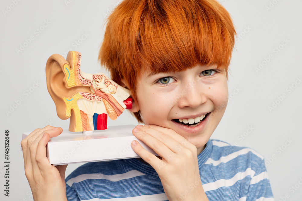 Red-haired positive boy with educational ear model in his hands demonstrates children's hearing health concept. Pediatric auditory examination