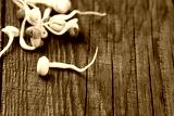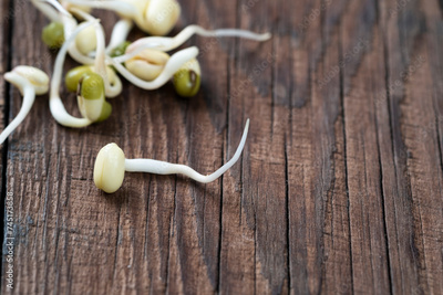 Sprouted mung beans on a wooden table. Healthy bean sprouts.